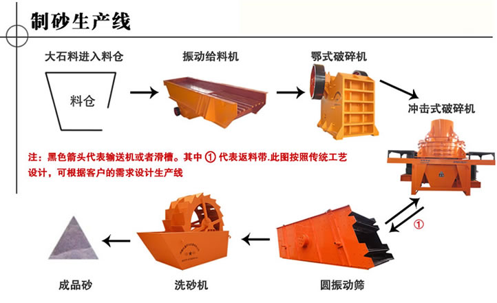 石料由粗破碎機(粗鄂式破碎機)進行初步破碎,然后,產出的粗料由膠帶輸送機輸送至細破機(細鄂式破碎機)進行進一步破碎,細碎后的石料進行振動篩篩分出兩種石子,滿足制砂機進料粒度的石子進制砂機治沙,另一部分料返回在進行細沙。進制砂機的石子一部分制成砂,經細紗機(可選)清洗后制成成品紗,另一部分進制砂機再次破碎,最終產生符合要求的各種砂料(石英莎生產線)